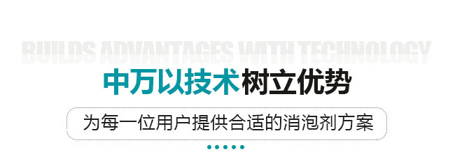 中萬是一家以解決各行業泡沫難題為使命的企業,專注于各行業不同工藝的泡沫應用研究,擁有8大體系成分產品,近2000個不同行業、不同細分領域工藝的成功應用經驗與解決方案,為您的生產工藝保駕護航。中萬在化工泡沫領域扮演著重要的角色,從嚴謹的選料到獨特的應用方案,推動著整個消泡劑行業的優化升級,中萬因領先而備受推崇,用技術成就高效,提方案帶來卓越,讓服務適應市場,中萬在消泡劑精益求精的道路上不斷地為客戶謀發展而開拓創造。
